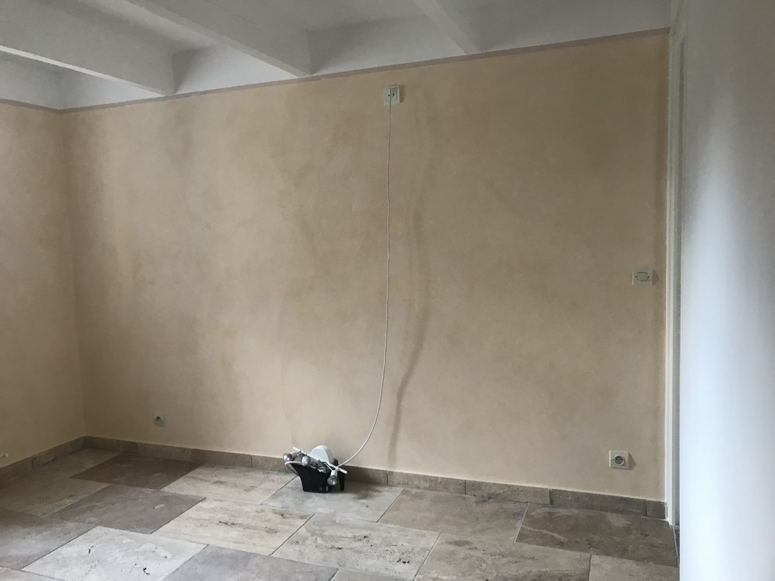 Une pièce à vivre assez de hauts murs passés au badigeon blanc, sauf un panneau coloré au cramoisi d’Alizarine … fille de la fameuse garance.